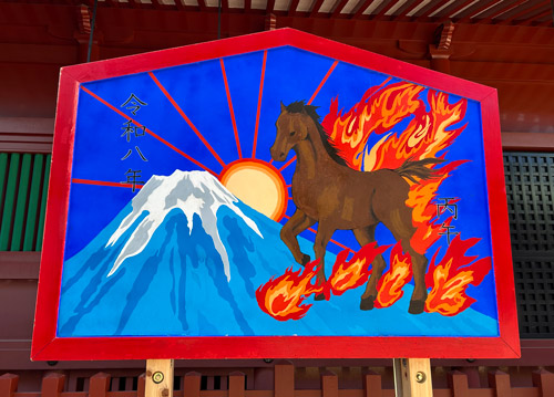 炎、馬、太陽、富士山というモチーフが使用されており生命力やエネルギーを感じられる絵馬です。