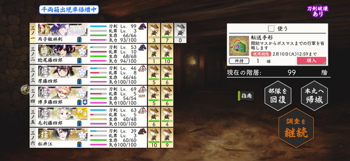初級:日向/不動/膝丸/蜻蛉切/次郎太刀/毛利/蜻蛉切/一期一振/太鼓鐘/次郎太刀